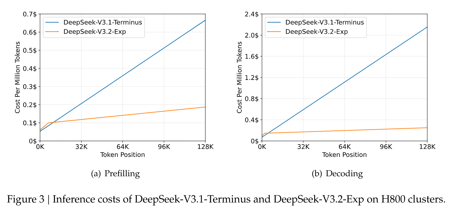 - Reducción Drástica de Costes: La Figura 3 del paper es concluyente. Muestra cómo el coste por millón de tokens, tanto en el prefilling (procesamiento del prompt inicial) como en el decoding (generación de la respuesta), se dispara linealmente en el modelo antiguo a medida que aumenta la longitud del contexto. En cambio, con DSA, la curva de coste se aplana drásticamente, demostrando un ahorro masivo en escenarios de contexto largo.